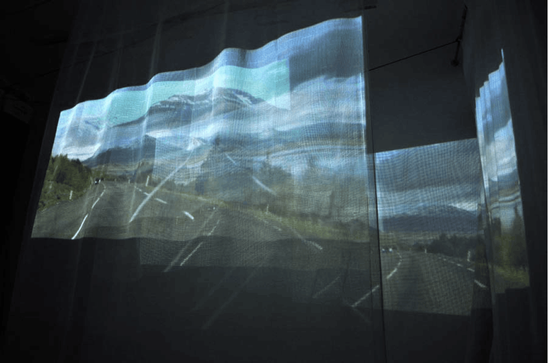 fahrenden Auto stehen im Mittelpunkt dieser Installation. Aus drei unterschiedlichen Richtungen projiziert vervielfältigen und überschneiden sich die Videosequenzen auf mehreren Schichten Tüll, die von der Decke herabhängen, als wollten sie es