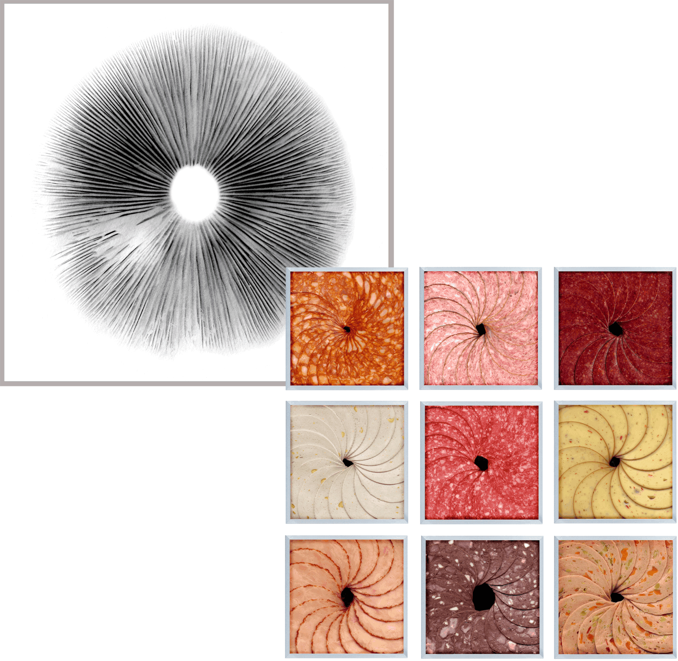 Die 9teilige Fotoserie zeigt nicht die Pilze, sondern ihre Sporen, die auf ein Blatt Papier - oder wie hier - direkt auf den Scanner fallen. Diese Technik wird verwendet zur näheren Pilzbestimmung, um die Farbe der Pilzsporen sichtbar zu machen. Der sehr feine Sporenstaub bildet dabei ein perfektes, fast plastisches Abbild der Pilzunterseite. Assoziationen zu Ringmuskeln sind nicht auszuschließen.