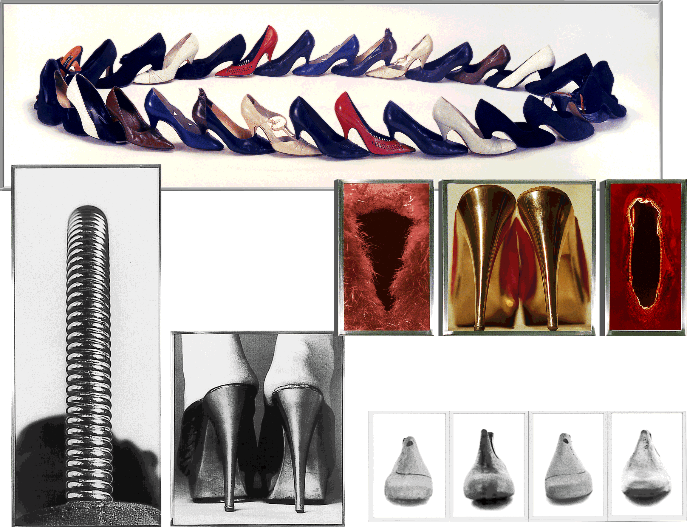 Es ist schon merkwürdig, wie ein neutrales, sozusagen „unschuldiges“ Objekt, seine Unschuld durch einen neuen, ungewöhnlichen Sinnzusammenhang verlieren kann. Die hohen Absätze der Damenstöckelschuhe werden durch den Kontext der Bilder zu Phallussymbolen. Man denkt sofort an Schuhfetischisten und sadomasochistischen Sex, an Damen der Nacht und an die Erotik der Modewerbung.